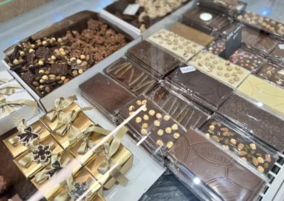 En plus des pâtisseries, Thierry Hommel propose une gamme de chocolats artisanaux. Ces douceurs sont fabriquées en partie avec Fabrice Dumay, artisan chocolatier reconnu. La carte comprend des ganaches, des truffes et des chocolats pralinés confectionnés sur place. Chaque pièce révèle des saveurs équilibrées et des textures raffinées. La fabrication maison reste la règle, sans recours aux préparations industrielles. Cette démarche donne une identité forte à la pâtisserie Thierry Hommel.